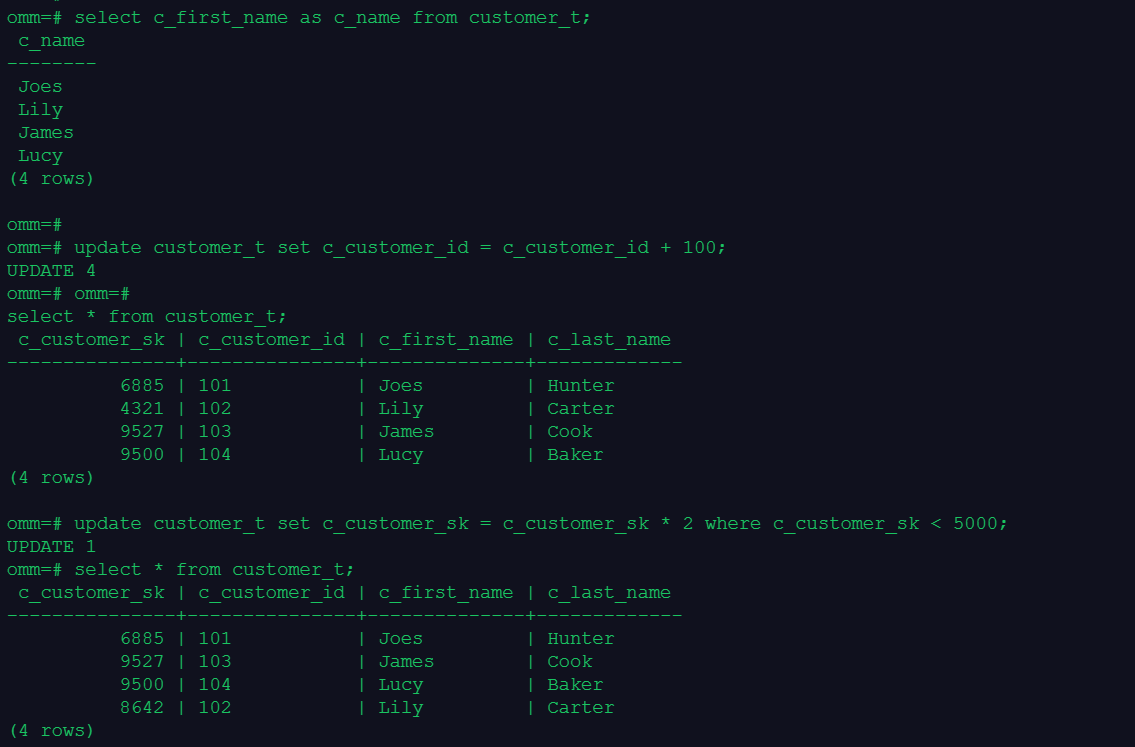 omm=# update customer_t set c_customer_sk = c_customer_sk * 2 where c_customer_sk < 5000;