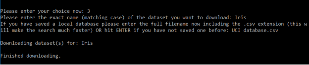 例如,如果要下载著名的Iris数据集,只需从菜单中选择选项3,输入存储的本地数据库的名称(以便搜索更迅速)。 就可以下载Iris数据集并将其存储在名为“Iris”的文件夹中!