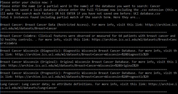 如果选择选项7,将使用关键字进行搜索,得到名称与搜索字符串匹配的所有数据集(甚至部分)的简短摘要。你还可以获得每个结果的网页链接,以便根据需要进一步探索数据。 下面的屏幕截图是使用关键词Cancer进行搜索的结果。
