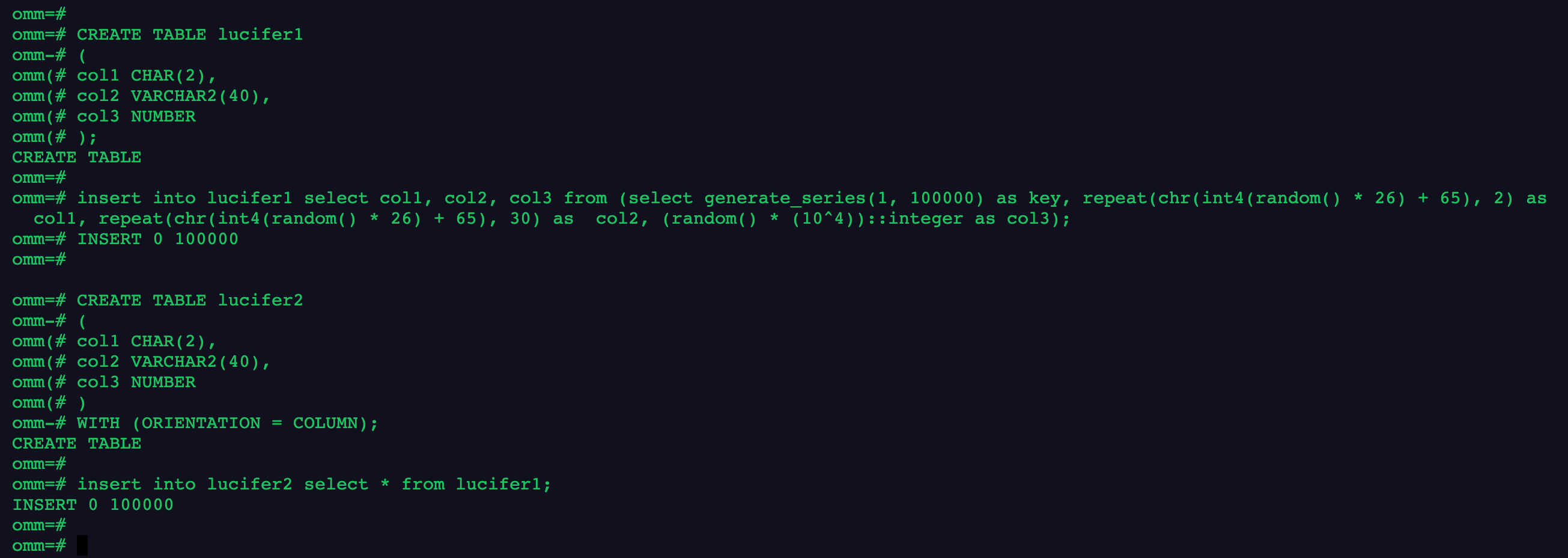 insert into lucifer1 select col1, col2, col3 from (select generate_series(1, 100000) as key, repeat(chr(int4(random() * 26) + 65), 2) as col1, repeat(chr(int4(random() * 26) + 65), 30) as col2, (random() * (10^4))::integer as col3);