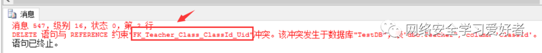 当我执行删除父行(Class)记录,级联到子行(Teacher),删除不了,触发外键约束