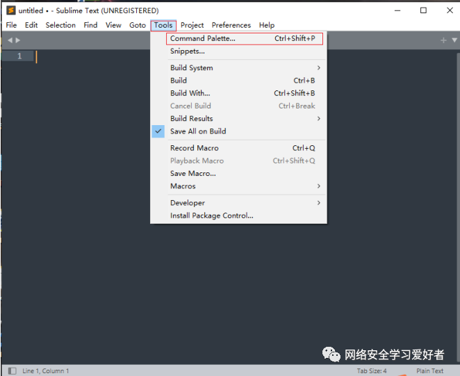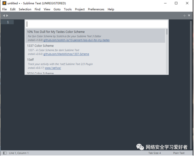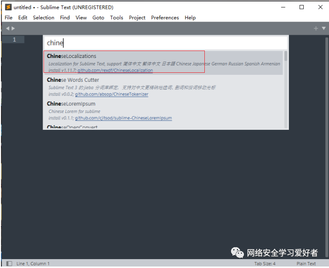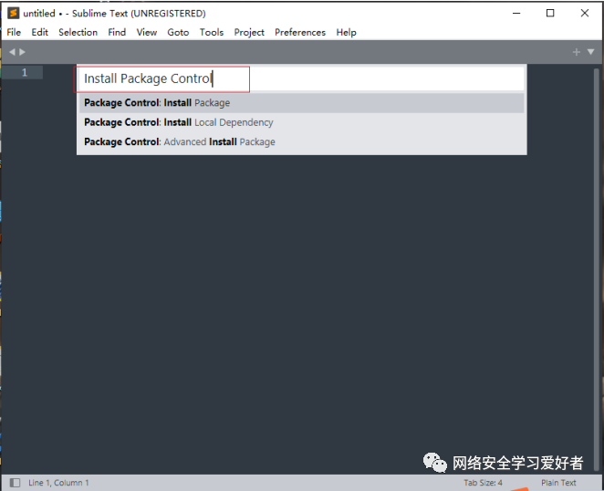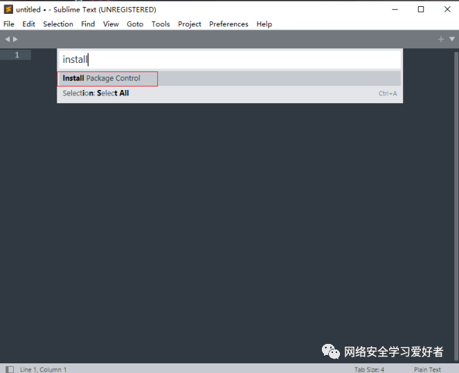3. 然后在弹出框中输入install,选择跳出的Install Package Control,选中后要等一会这个过程稍微慢一点