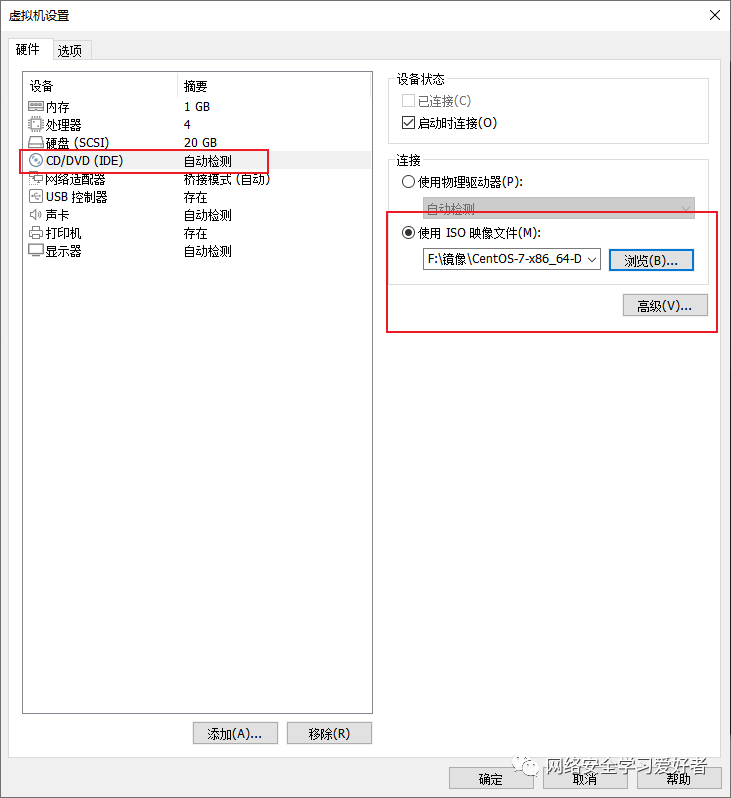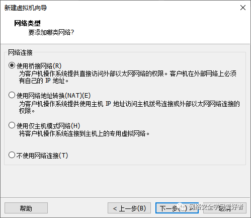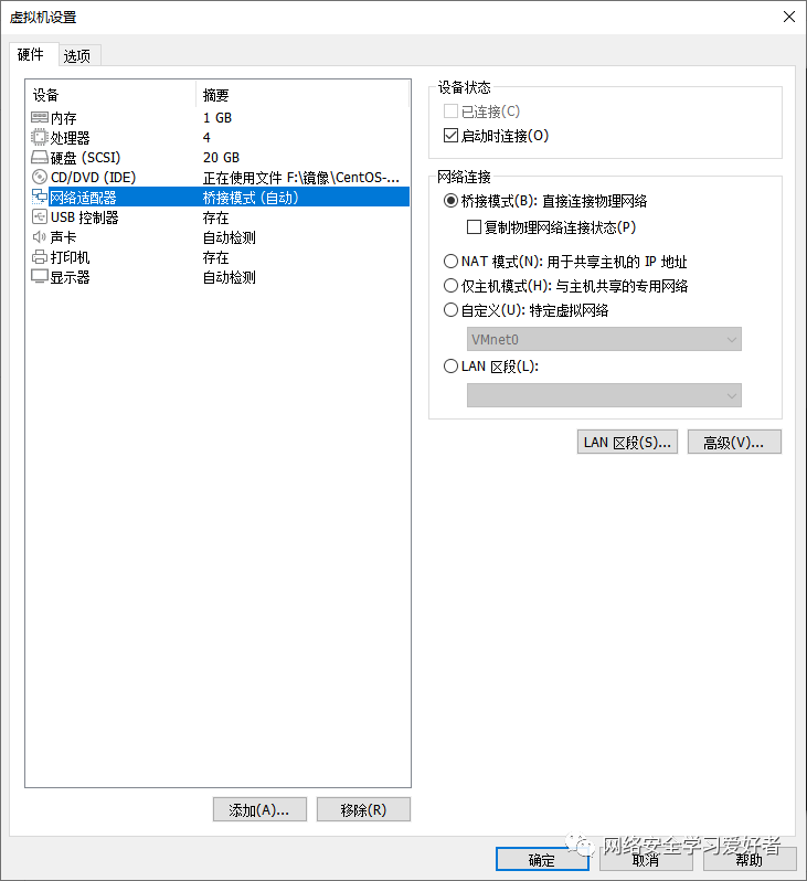 网络适配器的话可以根据自己的需要做相应的调整,默认的话是:NAT 模式(N):用于共享主机的IP地