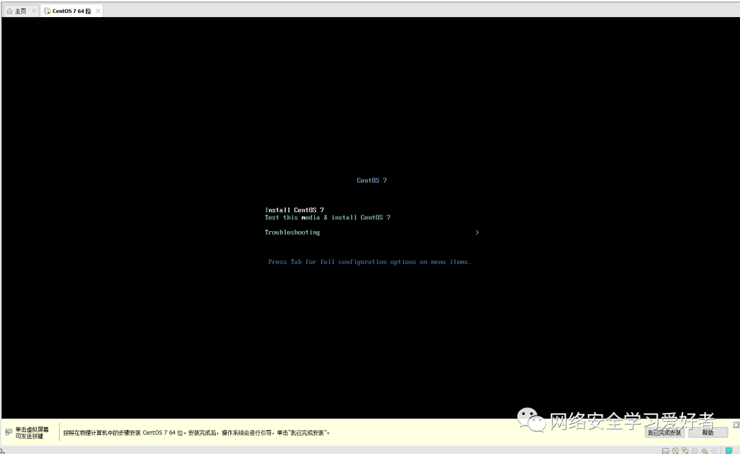 提示: 鼠标移动到虚拟机内部单击或者按下Ctrl + G,鼠标即可移入到虚拟机中 按下Ctrl + Alt,鼠标即可移出虚拟机