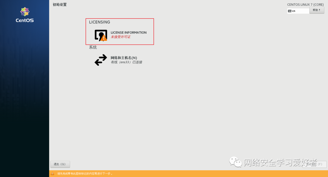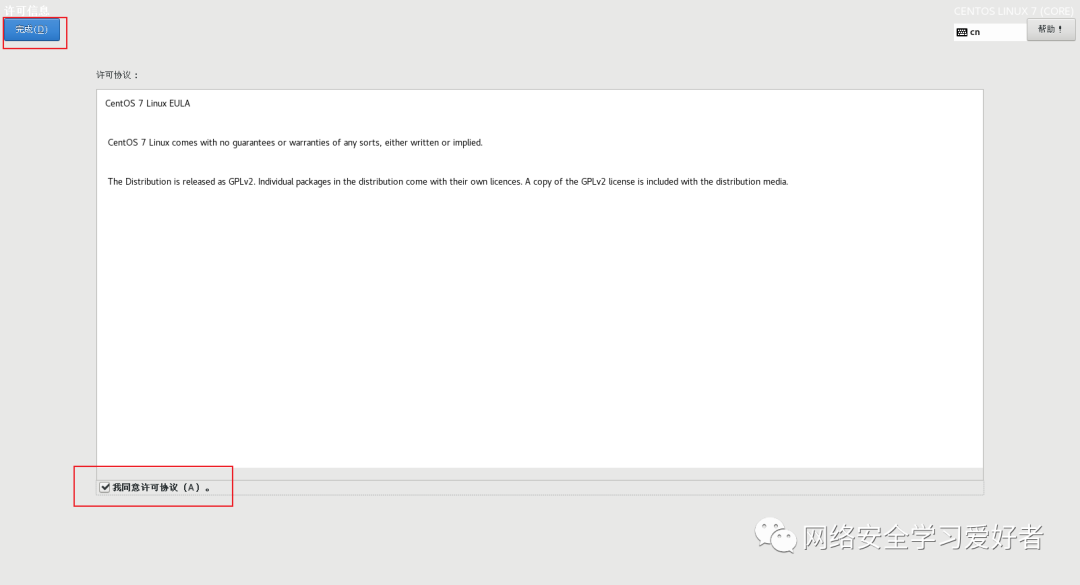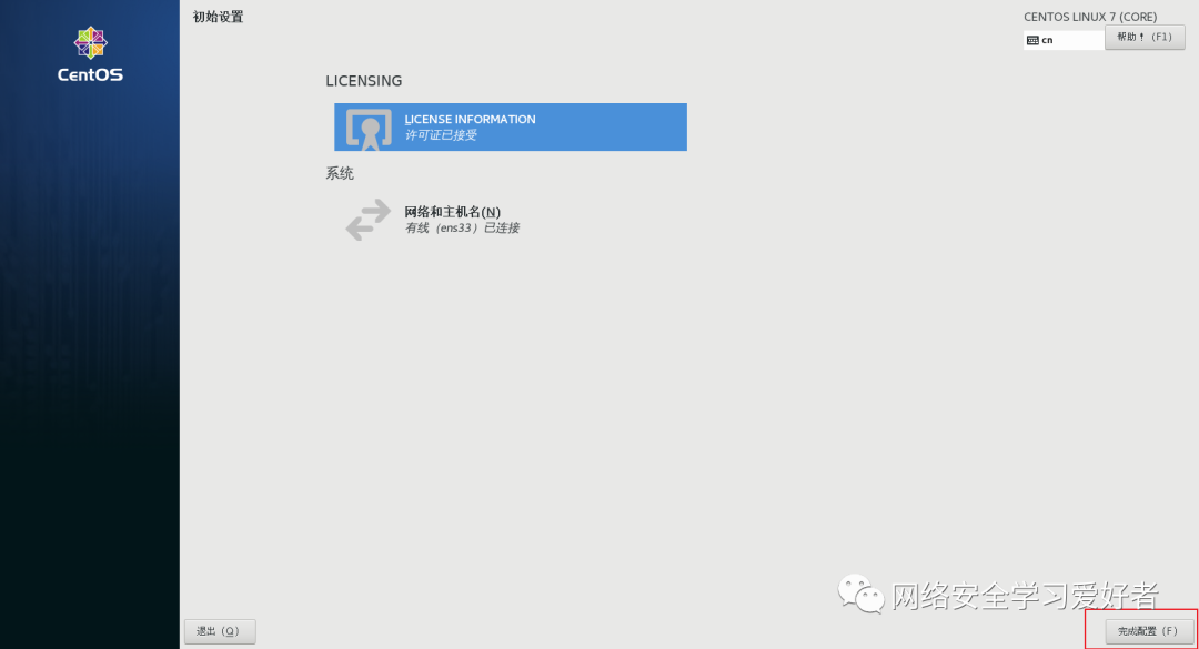 点击LICENSING->我同意许可协议前面打上对勾->点击完成