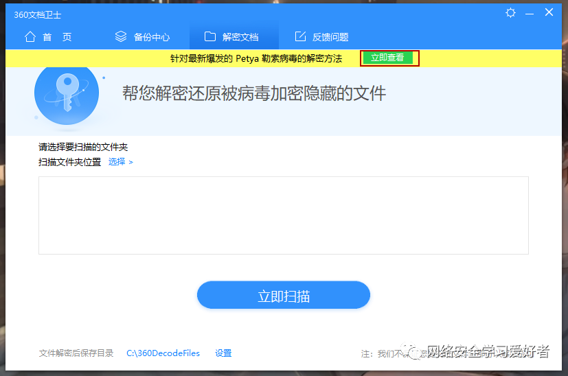 选择解密文档--立即查看,根据指示输入中病毒计算机的病毒对电脑的ID,输入完成后选择解密key,输入文档卫士提供的密钥,把密钥输进感染的电脑