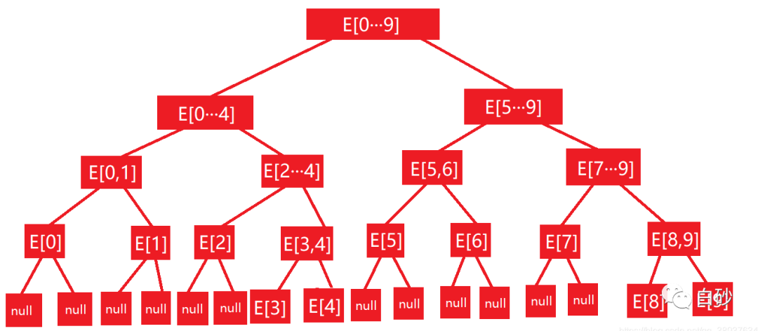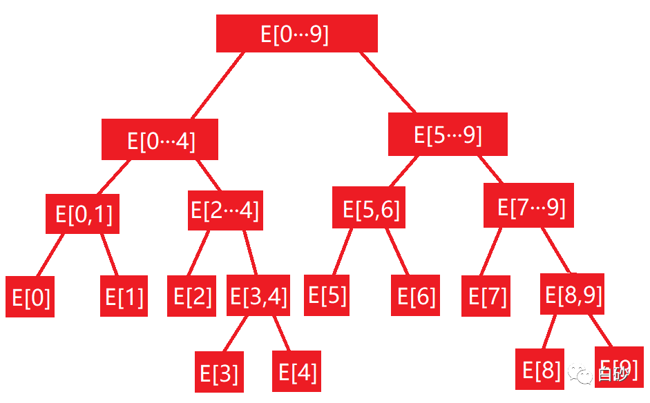 比如说区间[0, 9], 一共10个元素, 每个子节点的区间元素个数都是父节点的元素个数一半, 若出现 奇数 的情况, 则 右子树 元素区间 比 左子树 区间多一个.