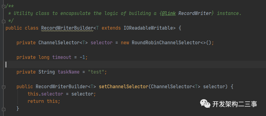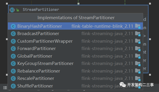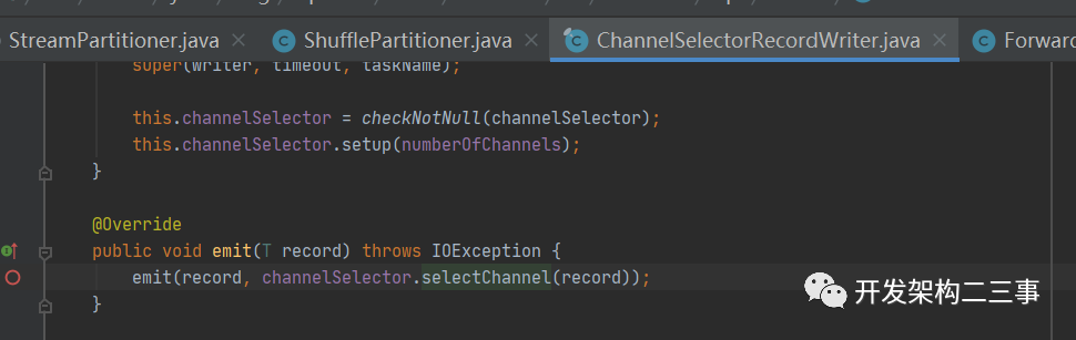 •void setup(int numberOfChannels):用输出通道的数量来对channel selector进行初始化操作,主要用于数据输出时使用;•selectChannel(T record):返回逻辑channel index,给定记录应写入该索引。broadcast模式的 channel selectors对应的这个方法不应该被调用,在实现时可以抛出UnsupportedOperationException。•isBroadcast() 方法:在broadcast模式下会选择所有的channel,这个方法用来标识是否是broadcast方法。