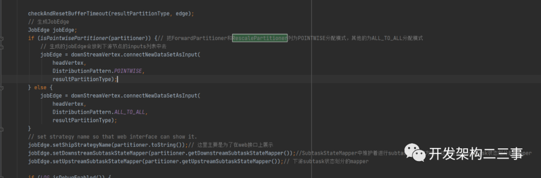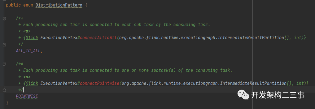 DistributionPattern.ALL_TO_ALL 就是简单的全连接,DistributionPattern.POINTWISE会根据上下游节点的并行度来调整,当上游分区与下游ExecutionJobVertex节点的并行度相同时会一对一连接;当上游分区并行度小于下游ExecutionJobVertex节点的并行度时,下游子 task 只会连接一个上游分区;当上游分区并行度大于下游子task并行度时,子 task 会连接多个上游分区。GlobalPartitioner是all_to_all模式的,一个上游会与下游子任务全连接,所以能全局控制channel为0,而ForwardPartitioner是pointwise的。二者partition的区别代码位于ResultPartitionFactory#create方法中,由于篇幅问题,后面再专门来分析了。