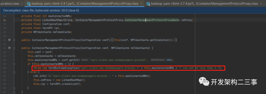 也就是说在都没有配置yarn.client.max-nodemanagers-proxies时,使用2.7.4版本的YarnConfiguration来获取yarn.client.max-nodemanagers-proxies值会返回yarn.client.max-cached-nodemanagers-proxies的值0;而使用2.4.1版本的YarnConfiguration时返回为null会在2.4.1版本的ContainerManagementProtocolProxy中使用默认值500。
