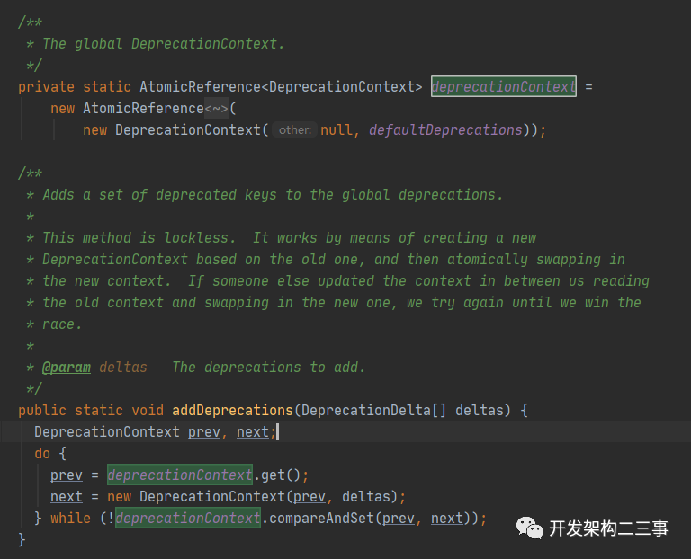 它默认初始化的是defaultDeprecations数组中的一些废弃参数与新的替代参数的映射,另外其他地方可以调用addDeprecations方法来添加新的映射值。