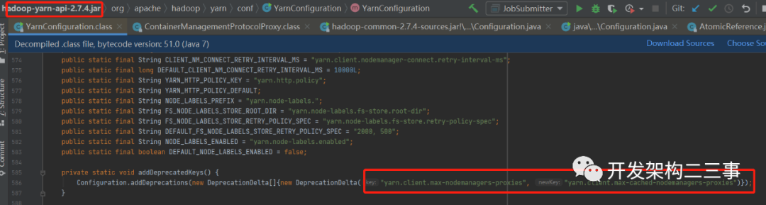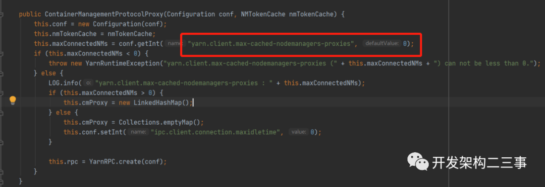 可以清楚地看到,它会向defaultDeprecations数组中添加一组新的映射值,即废弃掉yarn.client.max-nodemanagers-proxies,用yarn.client.max-cached-nodemanagers-proxies代替,而且对新参数的默认值也有设置: