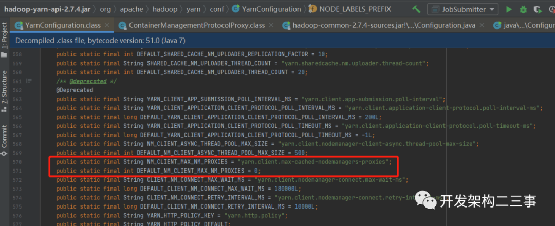 1.首先来查看实时计算平台上hadoop-yarn-client的依赖版本,查看后发现版本也是2.4.1,并无差异。2.由于两个地方都没有对yarn.client.max-nodemanagers-proxies进行手动配置,而上面从YarnConfiguration中获取yarn.client.max-nodemanagers-proxies的值时取到的不为空,导致默认填充值500没有生效,那么会不会是两个地方使用的YarnConfiguration中获取的值不同呢?于是添加日志打印输出(此处忽略这个过程),发现也并无差异。3.先是有点不太能理解了,转念一想,是不是使用了不同版本的YarnConfiguration,不同版本的有不同实现呢?查看一遍,果然如此。实时计算平台上使用的是2.4.1版本的YarnConfiguration,手动提交时使用的是2.7.4版本的YarnConfiguration。