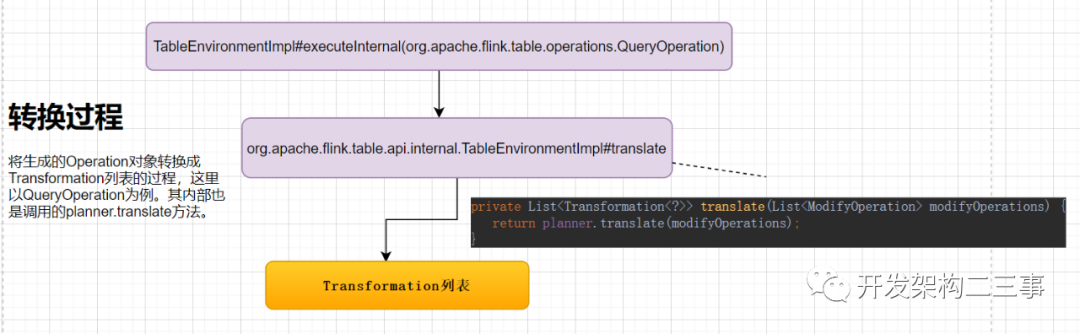 override protected def translateToPlan(execNodes: util.List[ExecNode[_, _]]): util.List[Transformation[_]] = {val planner = createDummyPlanner()planner.overrideEnvParallelism()execNodes.map {// 将execNode转成Transformationcase node: StreamExecNode[_] => node.translateToPlan(planner)case _ =>throw new TableException("Cannot generate DataStream due to an invalid logical plan. " +"This is a bug and should not happen. Please file an issue.")}}