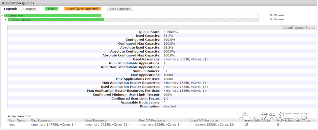 可以看到,集群中使用的是Capacity Scheduler调度器,也就是所谓的容量调度,这种方案更适合多租户安全地共享大型集群,以便在分配的容量限制下及时分配资源。采用队列的概念,任务提交到队列,队列可以设置资源的占比,并且支持层级队列、访问控制、用户限制、预定等等配置。但是,对于资源的分配占比调优需要更多的经验处理。但它不会出现在使用FIFO Scheduler时会出现的有大任务独占资源,会导致其他任务一直处于 pending 状态的问题。