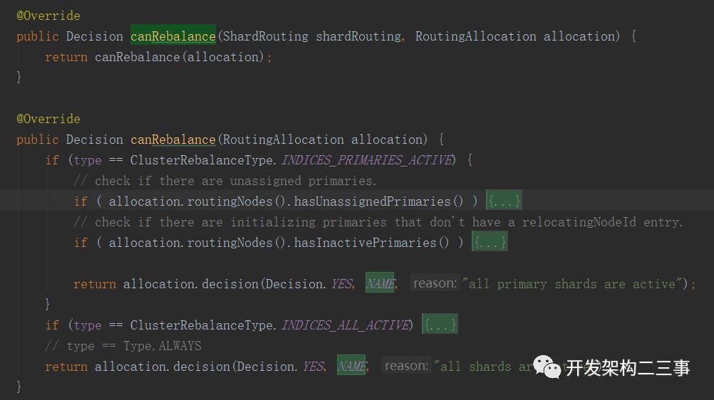 org.elasticsearch.cluster.routing.allocation.allocator.BalancedShardsAllocator.Balancer#decideRebalance: