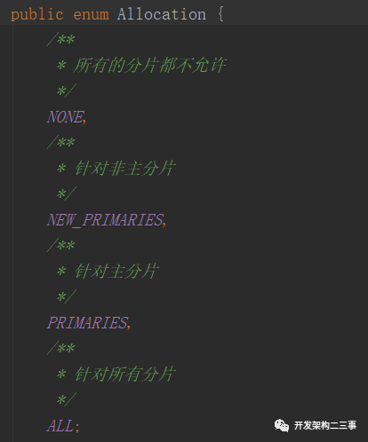 对于上面配置,还有两个值得一说的类型,org.elasticsearch.cluster.routing.allocation.decider.EnableAllocationDecider.Allocation: