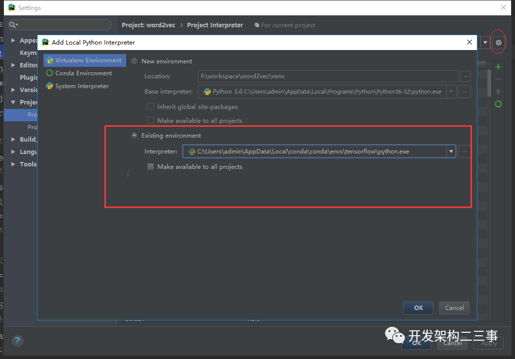 找到C:\Users\admin\AppData\Local\conda\conda\envs\tensorflow 然后将project interpreter 改为刚刚添加的即可