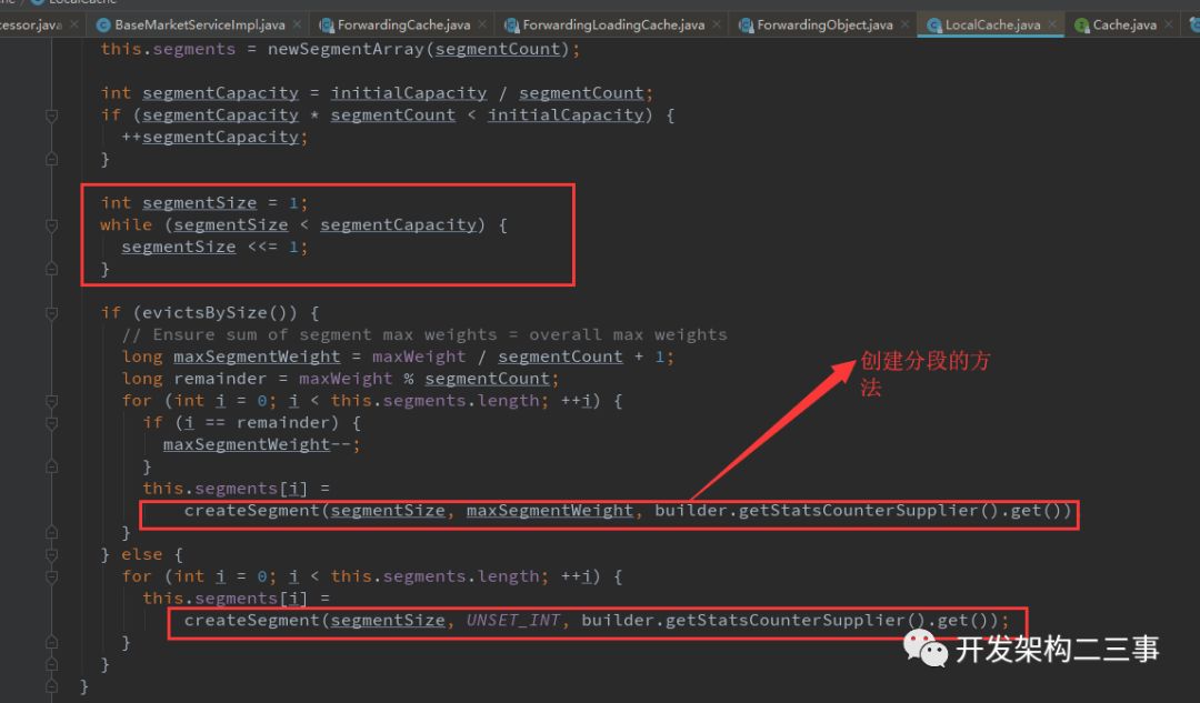 先分N个Segment加锁,Segment下面才是HashMap。这样就把原本一个锁,打散成N个锁。但和ConcurrentHashMap默认16个锁不一样,GuavaCache默认是4个锁。下面的concurrencyLevel是根据这个来设置的。