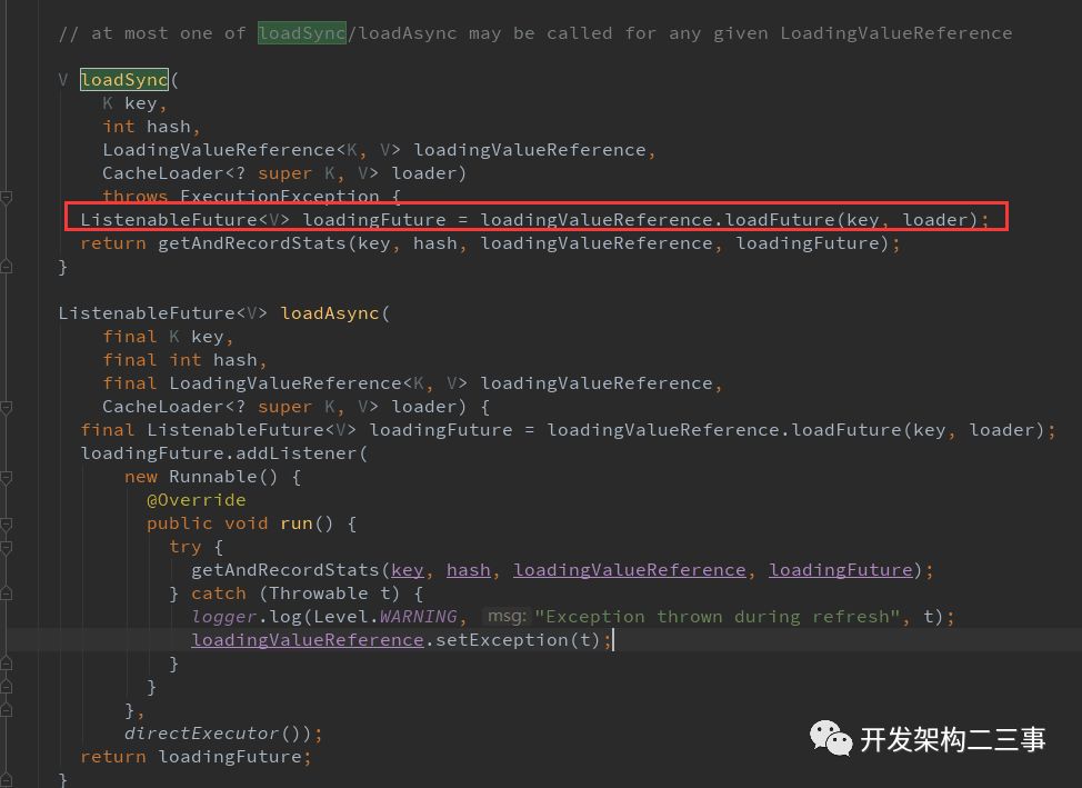 可以看到在com.google.common.cache.LocalCache.Segment#loadSync和com.google.common.cache.LocalCache.Segment#loadAsync方法中都有ListenableFuture