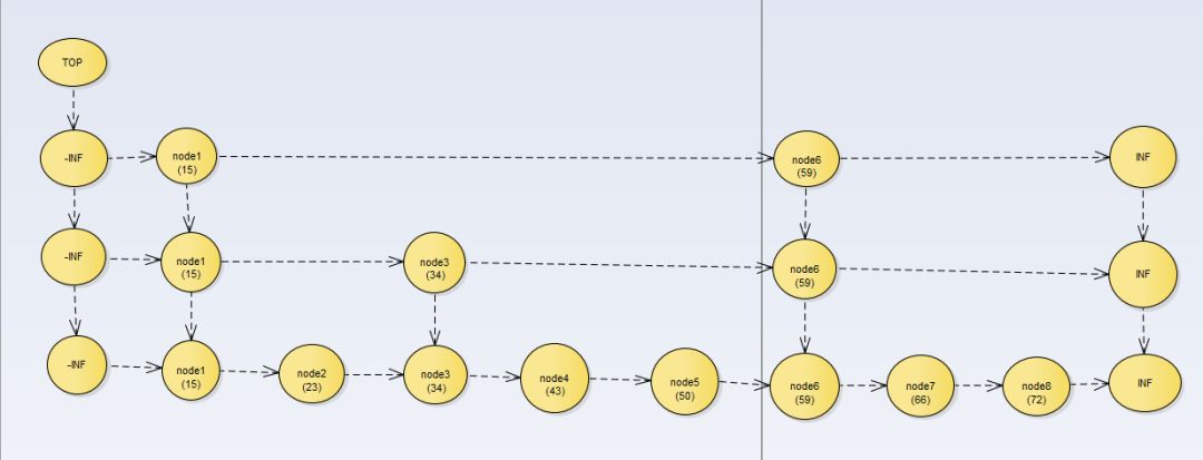 Skip List主要思想是将链表与二分查找相结合,它维护了一个多层级的链表结构(用空间换取时间),可以把Skip List看作一个含有多个行的链表集合,每一行就是一条链表,这样的一行链表被称为一层,每一层都是下一层的"快速通道",即如果x层和y层都含有元素a,那么x层的a会与y层的a相互连接(垂直)。最底层的链表是含有所有节点的普通序列,而越接近顶层的链表,含有的节点则越少。