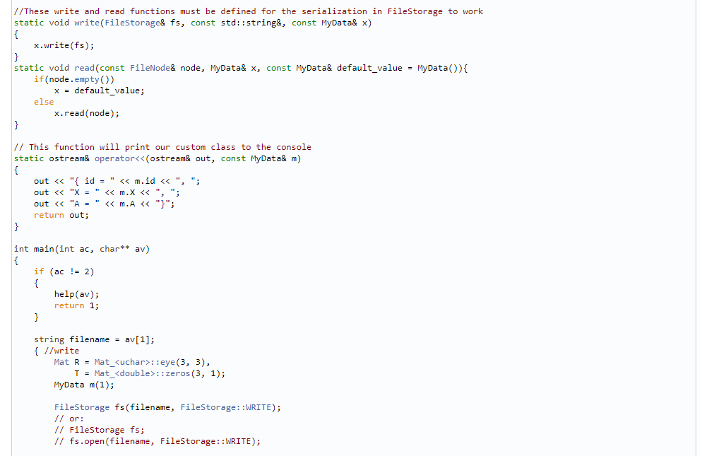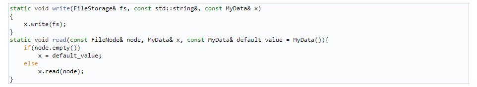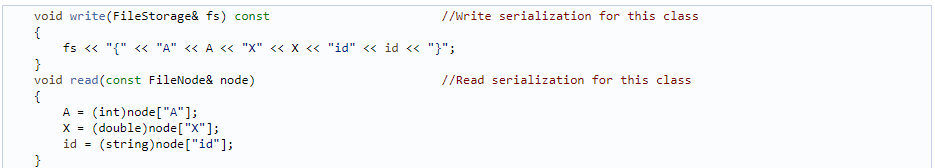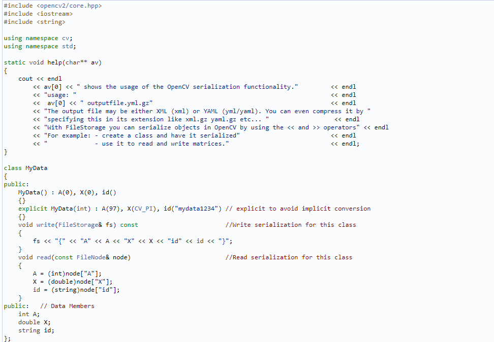 在C ++中,通过OpenCV 的XML / YAML I / O接口实现串行化?(仅针对OpenCV的数据结构),为自定义的类添加读取和写入函数。在Python中,可以在类的内部一个读取和写入函数来完成类似的操作。内部情况如下: