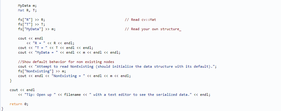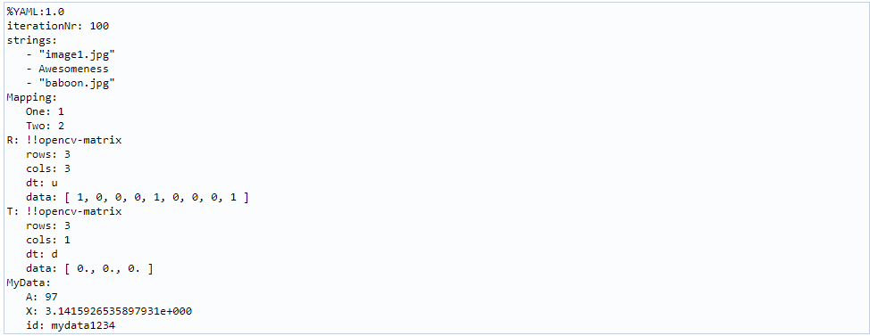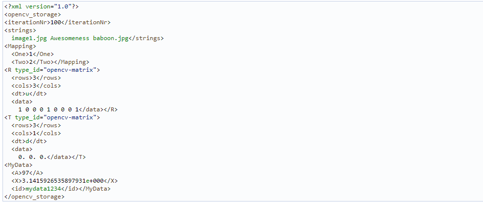 注:本文以C++语言代码为例,获取Java和python版本可在原文中查看:https://docs.opencv.org/4.5.2/dd/d74/tutorial_file_input_output_with_xml_yml.html
