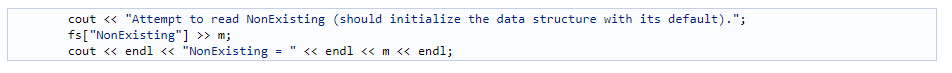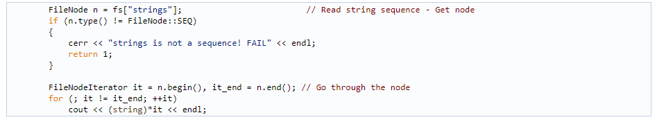 在读操作中,可以使用的和cv::FileNodeIterator两种数据结构。cv::FileStorage 类中的[]操作符(在Python中为 getNode()函数)可以返回一个数据类型。如果节点为序列结构,则可以使用CV :: FileNodeIterator进行迭代。在Python中,可以调用at()函数访问序列中的元素,并用size() 函数返回序列长度: