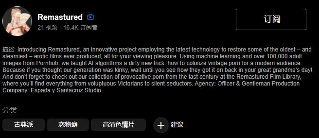 全球最大不可描述网站 PornHub 最近在自己的官网上,注册了一个名为 「Remastured」的视频发布账号,中文意为「重制」。截止目前,这个账号已经上传了 21 个视频(包含一部项目介绍视频),共计两万的订阅用户和近十万的播放量。这个账号的播放数据,对于日活 1.3 亿的 P 站(2021 年 4 月 8 日官方发布数据)来说并不出彩,但是这些视频的确非常与众不同。「Remastured 重制」账号下发布了经过 PornHub 技术团队 AI 修复的 20 部经典情色电影,时间跨度从 1896 年到 20 世纪四十年代。专辑中的第一部电影《A Kiss》上映于 1896 年,是由托马斯·爱迪生执导制作的(对,就是发明电灯泡的爱迪生)。《A Kiss》也是与《火车进站》、《工厂大门》等作品同时期上映的全球第一批商业放映的电影之一。这部作品源于爱迪生制作的舞台剧《寡妇琼斯》的最后一幕,以男女主角的亲吻画面结束全剧,爱迪生将这一幕拍摄成 25 秒的电影片段,并公开放映。这一个 25 秒的吻,何以被 Pornhub 列为经典情色片呢?PornHub 将《A Kiss》修复后,在描述中表示:这段画面,是人类电影史上记录到的第一个吻。自那时起,Porn 的概念已经在悄悄变化。但在 1896 年的美国,公开场合接吻、通过电影放映出来,这些是非常引起争议的。《A Kiss》中的这一幕,在当时被人们谴责为对观众造成冲击、淫秽。