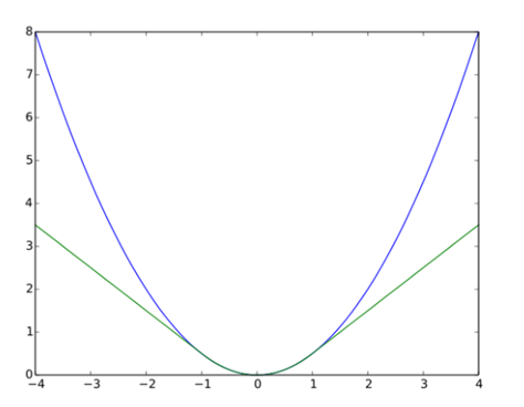 图2:Huber损失函数(绿色)和平方误差损失函数(蓝色)(来源:Qwertyus— Own work,CCBY-SA4.0,https://commons.wikimedia.org/w/index.php?curid=34836380)