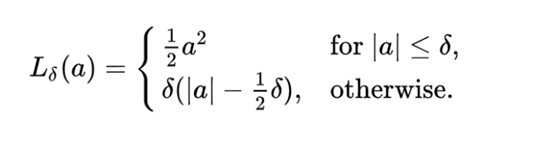 在此处,δ是阈值,a是误差(将计算出a,即实际标签和预测标签之间的差异)。当 |a|>δ时,loss = δ(|a|—(1/2)*δ)