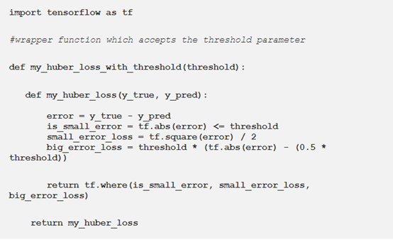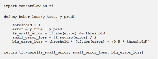 首先,定义一个函数—— my huber loss,它需要两个参数:y_true和y_pred,计算误差error a = y_true-y_pred。接下来,检查误差的绝对值是否小于或等于阈值,is_small_error返回一个布尔值(真或假)。当|a|≤δ时,loss= 1/2*(a)²,计算small_error_loss, 误差的平方除以2。否则,当|a| >δ时,则损失等于δ(|a|-(1/2)*δ),用big_error_loss来计算这个值。最后,在返回语句中,首先检查is_small_error是真还是假,如果它为真,函数返回small_error_loss,否则返回big_error_loss,使用tf.where来实现。