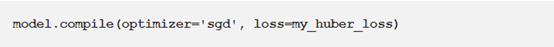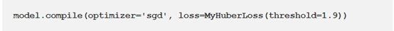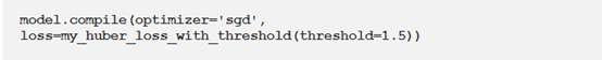 如果需要调整超参数(阈值),并在编译过程中加入一个新的阈值的话,必须使用wrapper函数进行封装,也就是说,将损失函数封装成另一个外部函数。在这里需要用到封装函数(wrapper function),因为损失函数在默认情况下只能接受y_true和y_pred值,而且不能向原始损失函数添加任何其他参数。使用封装后的Huber损失函数
