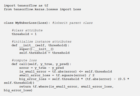 其中,MyHuberLoss是类名称,随后从tensorflow.keras.losses继承父类“Loss”, MyHuberLoss继承了Loss类,之后可以将MyHuberLoss当作损失函数来使用。__init__ 初始化该类中的对象。执行类实例化对象时调用函数,init函数返回阈值,调用函数得到y_true和y_pred参数,将阈值声明为一个类变量,可以给它赋一个初始值。在__init__函数中,将阈值设置为self.threshold。在调用函数中,self.threshold引用所有的阈值类变量。在model.compile中使用这个损失函数: