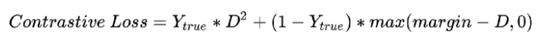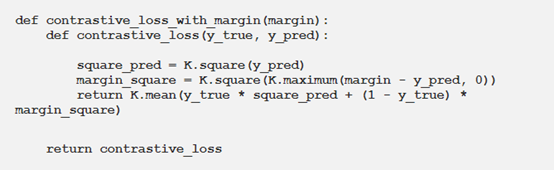 Siamese网络可以用来比较两幅图像是否相似,Siamese网络使用的损失函数为对比性损失。在上文的公式中,Y_true是关于图像相似性细节的张量,如果图像相似,则为1,如果图像不相似,则为0。D是图像对之间的欧氏距离的张量。边际为一个常量,用它来设置将图像区别为相似或不同的最小距离。如果为Y_true=1,则方程的第一部分为D²,第二部分为0,所以,当Y_true接近1时,D²的权重则更重。如果Y_true=0,则方程的第一部分变为0,第二部分会产生一些结果,这给了最大项更多的权重,给了D平方项更少的权重,此时,最大项在损失计算中占了优势。使用封装器函数实现对比损失函数: