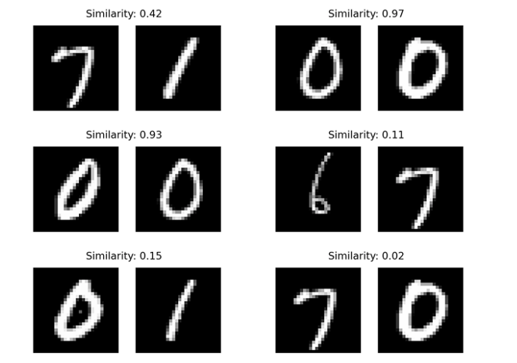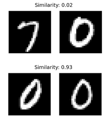 图1:使用孪生网络比较两张图像的相似度会得出相似度分数。分数越接近“ 1”,图像越相似(因此更可能属于同一类别)。相反,分数越接近“ 0”,两个图像就越不相似。在上周的教程中,您学习了如何训练孪生网络以验证两对数字是属于同一类别还是不同类别。并将训练后的孪生模型序列化到磁盘。“我们如何使用我们训练好的孪生网络来预测两个图像之间的相似性?”答案是我们利用孪生网络中最后一层,即Sigmoid激活函数。Sigmoid激活函数的输出范围为[0,1],这意味着当我们向孪生网络输入图像对时,模型的输出值在0到1之间。值0表示两个图像完全不同,而值1表示两个图像非常相似。这种相似性的一个示例可以在本节前边部分的图1中看到:将“ 7”与“ 0”进行比较,相似度得分仅为0.02。