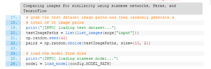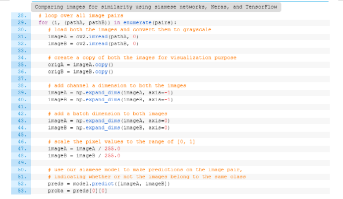 2. 复制两张图片以便后序画图/可视化(35, 36行)3. 沿着batch维度添加一个通道的维度(43, 44行)4. 将像素值由[0, 255]缩放到[0, 1], 就像我们上周训练孪生网络那样(47, 48行)(https://www.pyimagesearch.com/2020/11/30/siamese-networks-with-keras-tensorflow-and-deep-learning/)