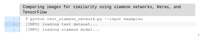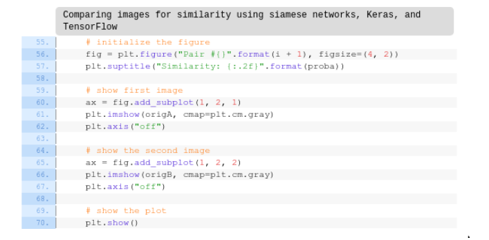 一旦imageA和imageB处理完, 我们调用孪生网络模型(52行)的.predict()方法比较他们的相似度, 得到两张图片的概率/相似度分数(53行)最后一步是在屏幕上展示两张图片以及相应的相似度分数