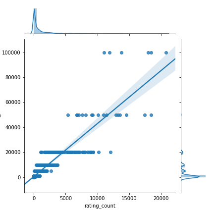 sns.jointplot(x =“ rating_count”,y =“ units_sold”,data = df,kind =“ reg”)