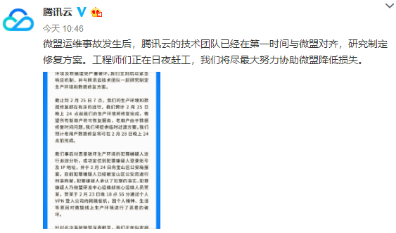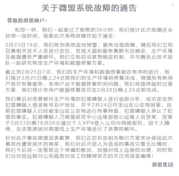 微盟的业务系统数据库(包括主备)遭遇其公司运维人员的删除。目前微盟技术团队正在努力恢复数据,但数据恢复较慢。目前对新用户服务已经恢复正常,但老用户数据官方预计要到2月28日才有结果……