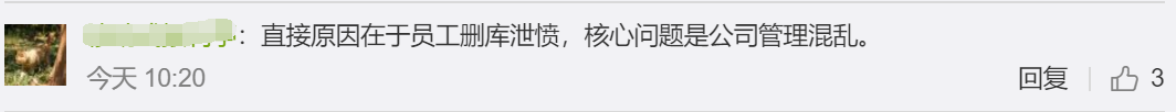 也有网友提出:直接原因在于员工删库泄愤,核心问题是公司管理问题混乱。