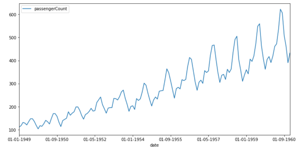 Airpassenger = Airpassenger.set_index('date')pyplot.rcParams["figure.figsize"] = (12,6)Airpassenger.plot()pyplot.show()
