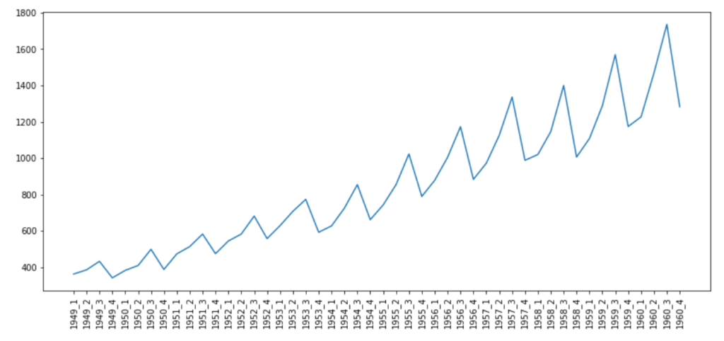 pyplot.rcParams["figure.figsize"] = (14,6)pyplot.plot(airPassengerByQtr)pyplot.xticks(airPassengerByQtr.index, rotation='vertical')