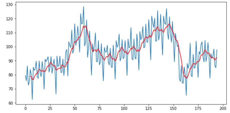 Import pandas as pdfrom matplotlib import pyplotelecequip = pd.read_csv(r"C:/Users/datas/python/data/elecequip.csv")# Taking moving average of last 6 obsrolling = elecequip.rolling(window=6)rolling_mean = rolling.mean()# plot the two seriespyplot.plot(elecequip)pyplot.plot(rolling_mean, color='red')pyplot.show()