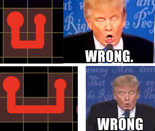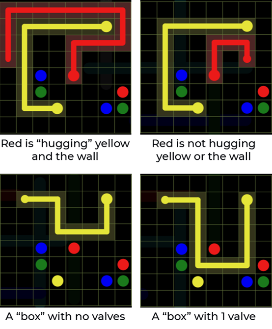 近似Q-learning的应用是十分有吸引力的,尤其是在游戏中。与其让智能体在给定的状态下决定最佳的操作,不如让它在每一步都能快速计算出一些直观、独立于具体状态(棋盘的配置)之外的特性,并让它自己决定哪些是最重要的。这在游戏中会担任游戏改变者的角色,例如Pcaman(举个例子,下一步的决策是基于最近的豆子和最近的幽灵,而不是在每种可能状态下的一个动作),当然也可以是状态数量太多,以至于让准确Q-learning失效的Flow Free。现在是开发人员需要权衡利弊挑选“正确”的特征的时候了。于是,我将列表精简到只有我认为在很多情况下重要的特征(例如,每条路径的剩余曼哈顿距离)。还有一些我认为重要的、只需要让算法计算的特征(但无法证明)。这些特征包括: