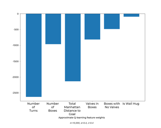 不幸的是,有了这些特征之后,Q-learning智能体甚至不能解决小型板问题,即使我们改变了Q-learning的参数也不行。但是,这也是个有趣的实践。例如,该算法在“没有阀门的盒子”上附加了一个强大的负权重,这意味着它能够了解到,没有阀门的盒子会导致谜题无法解决。