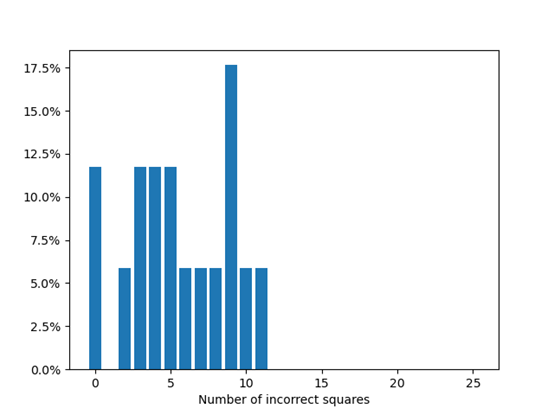 一位朋友指出,这实际上是游戏AI中增加数据点的常见方式。在720x的数据点的情况下,我们最终在一个20-epoch模型,使用大小约为200k的数据点测试集,在我7岁的GPU上运行了20分钟后得到的准确率为12%。需要注意的是,我们在这里使用了一个严格的衡量成功的标准:即使板子少用了一个单元格,我们也将其视为失败。但是,失败比成功有趣得多。在几乎所有的失败中,CNN正确地解决了板子的很大一部分,剩下的部分人们则很容易完成它。从这个意义上讲,CNN能够解决文章最初的问题:凭直觉学习人类的技巧: