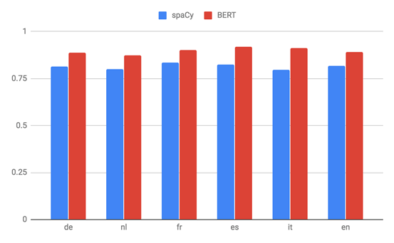 这些增强方法不仅帮助我们创建了一个比原始训练集大很多倍的训练集;通过采样和替换训练数据的各个部分,它们还向学生模型告知哪些单词或短语对其教师的输出有影响。此外,为了给它尽可能多的信息,我们不会向学生显示其老师为某项物品预测的标签,而是显示它的精确输出值。通过这种方式,小型模型可以了解最佳类别到底有多准确,以及与其他类别的比较。Tang等(2019)用老师的对数训练了小模型,但是我们的实验表明使用概率也可以得到很好的结果。模型蒸馏的最大优点之一是它与模型无关:教师模型可以是一个黑匣子,而学生模型可以具有我们喜欢的任何架构。为使实验简单,我们选择了与基线相同的spaCy文本分类器作为学生。训练过程也保持不变:我们使用相同的批次大小,学习速率,退出和损失函数,并在训练数据的准确性停止上升时停止训练。我们使用上述的扩充方法将每种语言的大约60,000个示例的合成数据集组合在一起。然后,我们收集了经过微调的BERT模型针对这些数据的预测。连同原始训练数据,这已成为我们较小spaCy模型的训练数据。