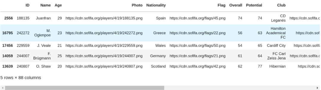 加载速度很快。现在介绍一下data.sample(5),这是一个随机选择行的方法。如果不知道数据是如何排序的,最好使用.sample()而不是.head()。