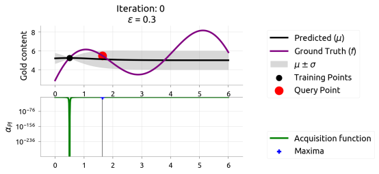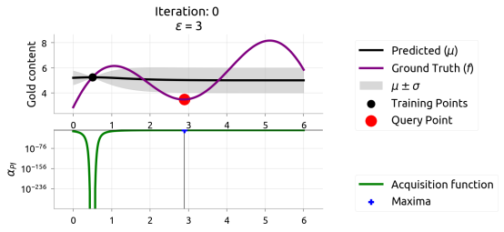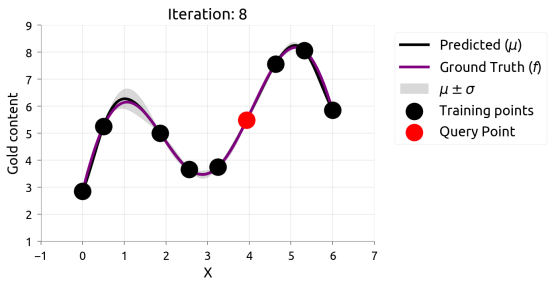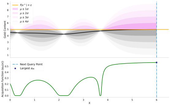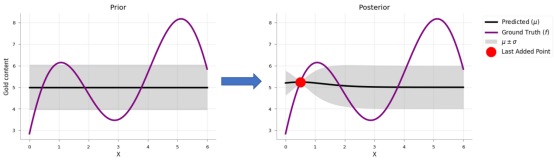 每个新数据点都会更新我们的代理模型,从而使模型更接近于真实情况。黑线和灰色阴影区域表示钻孔前后金子分布估算中的平均值(μ)和不确定性(μ±σ)。